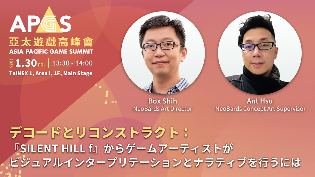 ネオバーズのアートディレクター Box Shih 氏及びアートリーダー Ant Hsu 氏が 2026 アジア太平洋ゲームサミット(APGS)にご招待を受け、「デコードとリコンストラクト:『SILENT HILL f』からゲームアーティストがビジュアルインタープリテーションとナラティブを行うには」というテーマで基調講演を行う予定になっております。